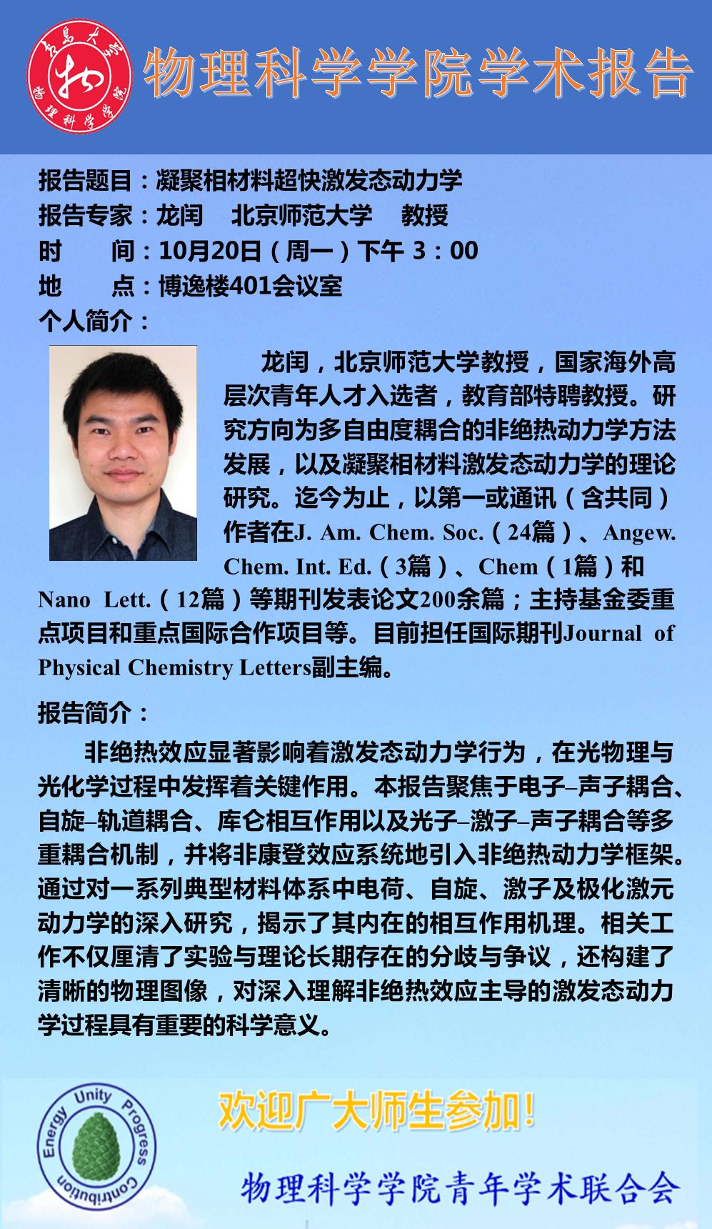 [学术预告]龙闰-凝聚相材料超快激发态动力学