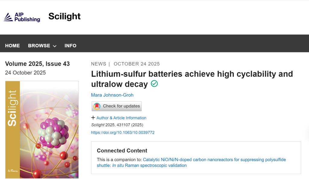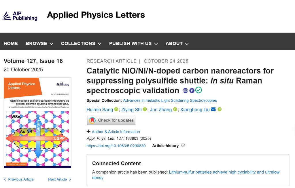 近期,物理科学学院刘相红教授团队在自然指数期刊Applied Physics Letters发表题为“Catalytic NiO/Ni/N-Doped Carbon Nanoreactors for Suppressing Polysulfide Shuttle: In-situ Raman Spectroscopic Validation”的研究论文。该研究成果被编委会推荐为Featured Article,并被美国物理学联合会《科学之光》(Scilight)专访报道。