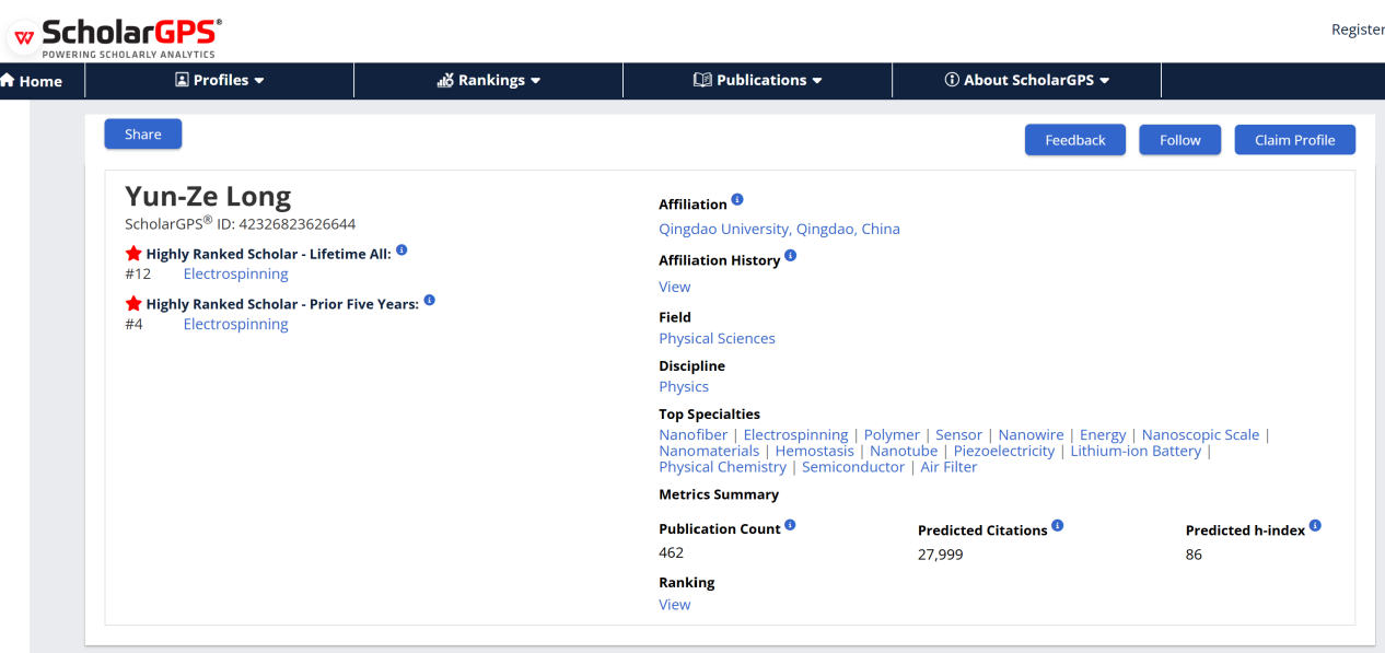 近日,国际学术评价机构 ScholarGPS发布了2025年全球学者排名,以“终身”为统计周期,我院龙云泽教授在“静电纺丝”领域全球排名第十二,以“过去五年”为统计周期,龙云泽教授在“静电纺丝”领域全球排名第四。该排名基于全球超过3000万学者和12000家科研机构的科研产出、学术影响力及引用质量进行量化分析,数据库覆盖2亿篇出版物和30亿次引用,是国际公认的完全量化学术排名体系。