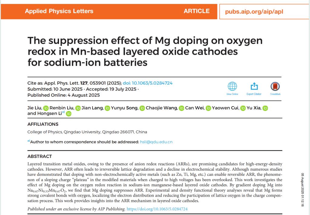 近日,我院李洪森教授团队在钠离子电池层状正极材料研究领域取得新进展,团队发表在物理领域自然指数收录期刊Applied Physics Letters上的研究成果,凭借广泛的学术关注度与社会影响力,荣获美国物理联合会“AIP Publishing 2025年度社交媒体影响力论文奖”。