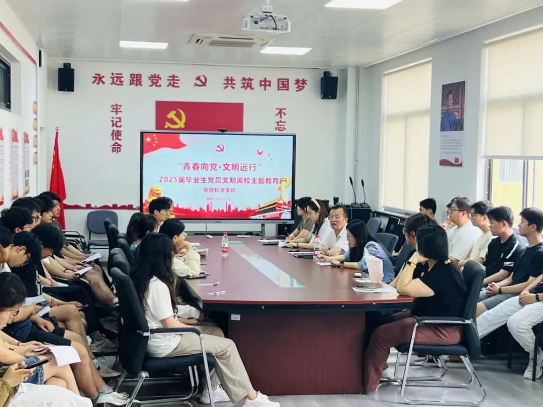 为切实做好毕业生党员离校前工作,坚定毕业生党员理想信念,充分发挥党员先锋模范作用,物理科学学院于6月16日组织开展“青春向党,文明远行”2025届毕业生党员文明离校主题教育活动。此次会议由物理科学学院学生第一党支部书记杜彦臻主持,学院党委书记郝伟、党委副书记董永红、学生第二党支部书记赵珊及全体毕业生党员参加此次活动。