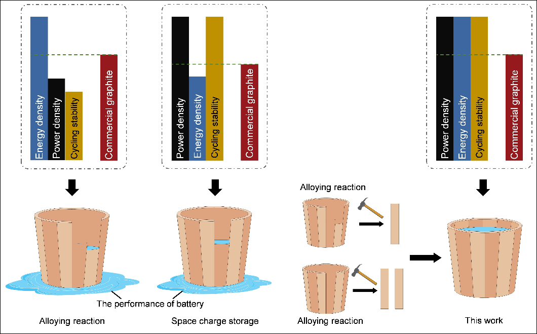 随着锂离子电池在电动汽车及大规模储能等领域的快速发展,同时实现高能量密度与高功率密度成为当前研究的核心挑战之一。传统石墨负极受限于较低的理论容量与不足的倍率性能,难以满足应用需求;Sn基负极虽具备较高理论容量,但在循环过程中存在体积膨胀及反应动力学缓慢等问题。近年来,空间电荷存储机制因其优异的快速充放电能力受到关注,但其能量密度仍存在不足。因此,如何将空间电荷机制与传统储能机制有效结合,实现性能协同提升,成为亟需解决的关键科学问题。针对上述问题,研究团队设计并构建了一种混合电子/离子/合金导体材料(Fe/LiO-Sn),通过将空间电荷存储机制与Sn的合金化反应进行耦合,实现两种机制的优势互补,从而兼顾高能量与高功率输出。研究表明,金属Fe与Li2O之间的强界面作用及其丰富界面结构,有效构建了电子与离子协同传输通道,显著促进锂离子的快速扩散;与此同时,Sn的合金化反应在该体系中不仅保持了较高理论容量,得益于混合电子/离子/合金导体的结构设计表现出明显改善的反应动力学。通过XPS、XANES、EXAFS及磁学分析等多种表征手段,系统揭示了该材料中空间电荷储能与合金化反应的协同机制。电化学测试结果表明,该电极在40 A g-1的高电流密度下仍可稳定工作,并实现1242 Wh kg-1的高能量密度,在10 A g-1条件下循环20000次后容量保持率达87%,展现出优异的倍率性能与循环稳定性。该研究从机制设计角度出发,为构建兼具高能量密度与高功率密度的锂离子电池负极材料提供了新的思路,对高性能储能体系的开发具有重要意义。